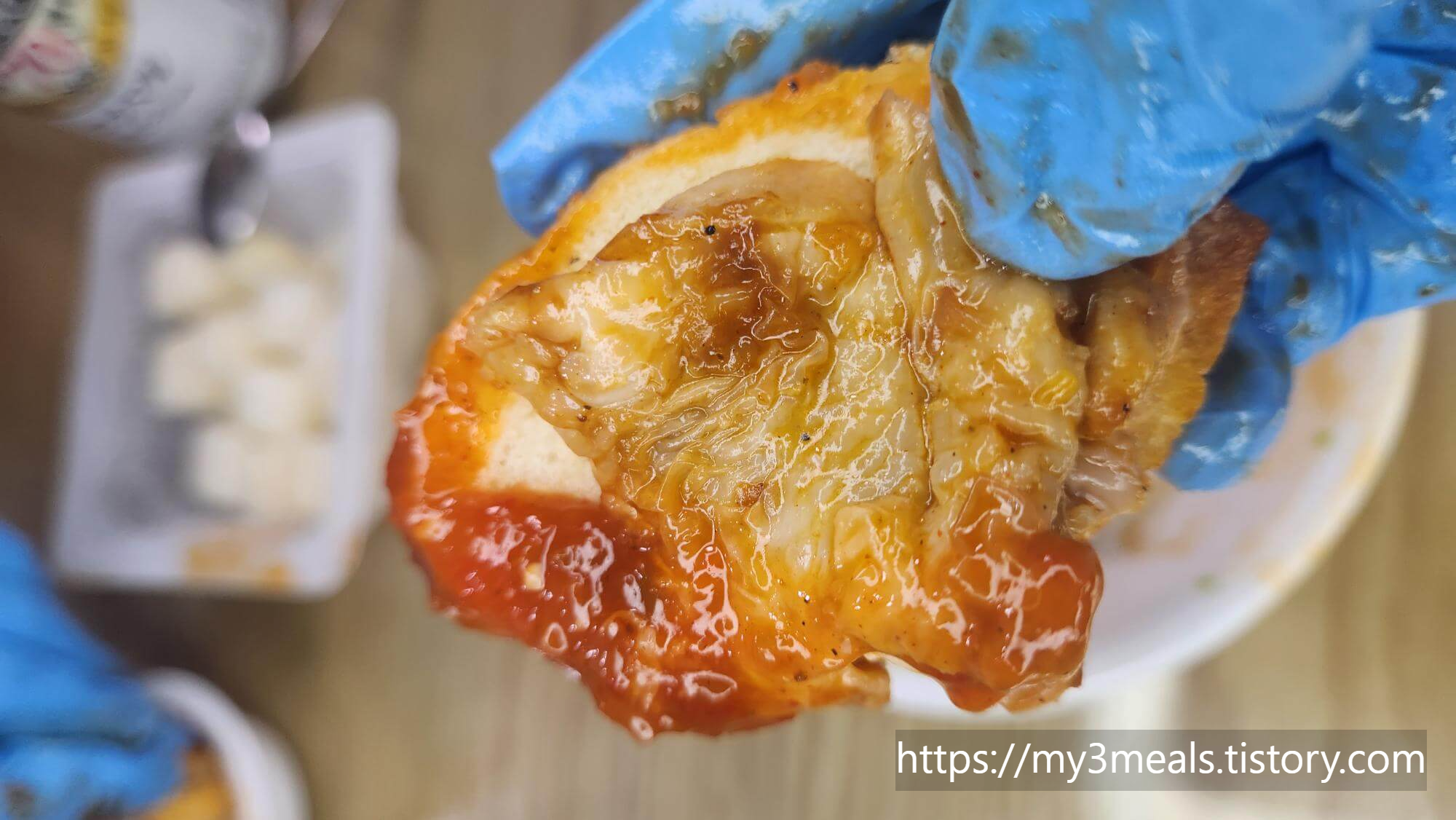 바게트에 닭살 찢어 얹고 소스 살짝 뿌려 먹으면 오픈샌드위치 느낌도 나고, 조합이 미쳤습니다.맛/식감/조합 완벽했던 이유