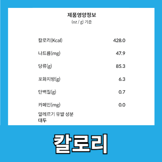 성분 양 칼로리 (Kcal) 428.0 나트륨 (mg) 47.9 당류 (g) 85.3 포화지방 (g) 6.3 단백질 (g) 0.7 카페인 (mg) 0.0 영양 정보와 포만감