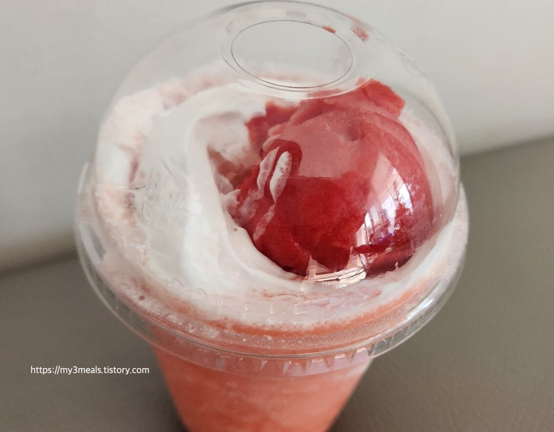 ‘딸기젤라또 퐁당 프라페’는 첫눈에 보자마자 감탄이 절로 나오는 비주얼을 자랑했어요. 맑은 딸기 스무디 위에 부드러운 휘핑크림이 올려져 있고, 그 위에는 큼직한 딸기젤라또가 포인트로 자리 잡고 있었죠. 보기만 해도 상큼함과 달콤함이 전해져, 마시기 전부터 기대감이 차올랐습니다.