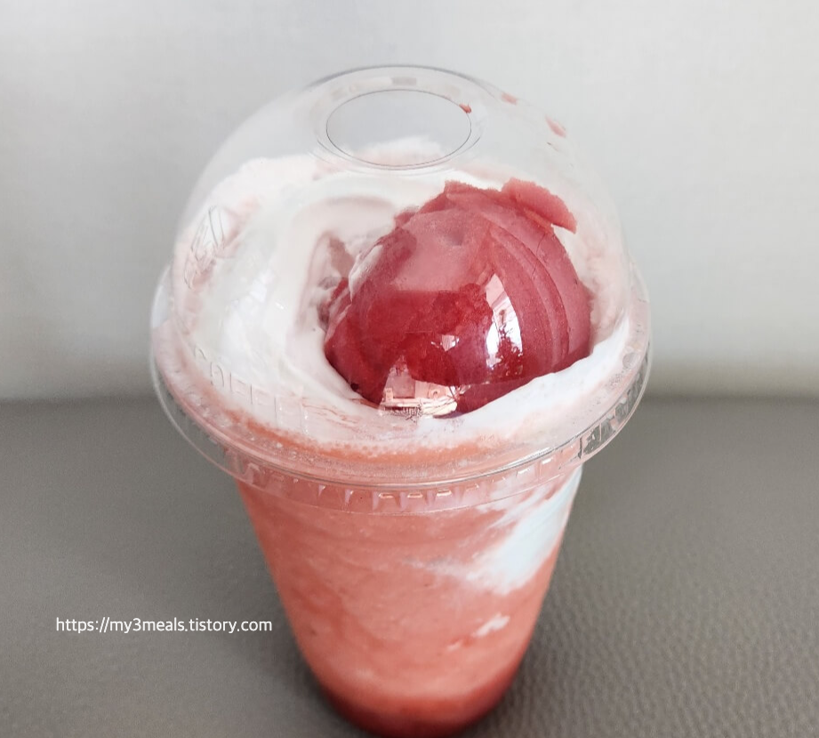 ‘딸기젤라또 퐁당 프라페’는 첫눈에 보자마자 감탄이 절로 나오는 비주얼을 자랑했어요. 맑은 딸기 스무디 위에 부드러운 휘핑크림이 올려져 있고, 그 위에는 큼직한 딸기젤라또가 포인트로 자리 잡고 있었죠. 보기만 해도 상큼함과 달콤함이 전해져, 마시기 전부터 기대감이 차올랐습니다.