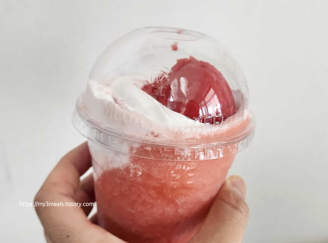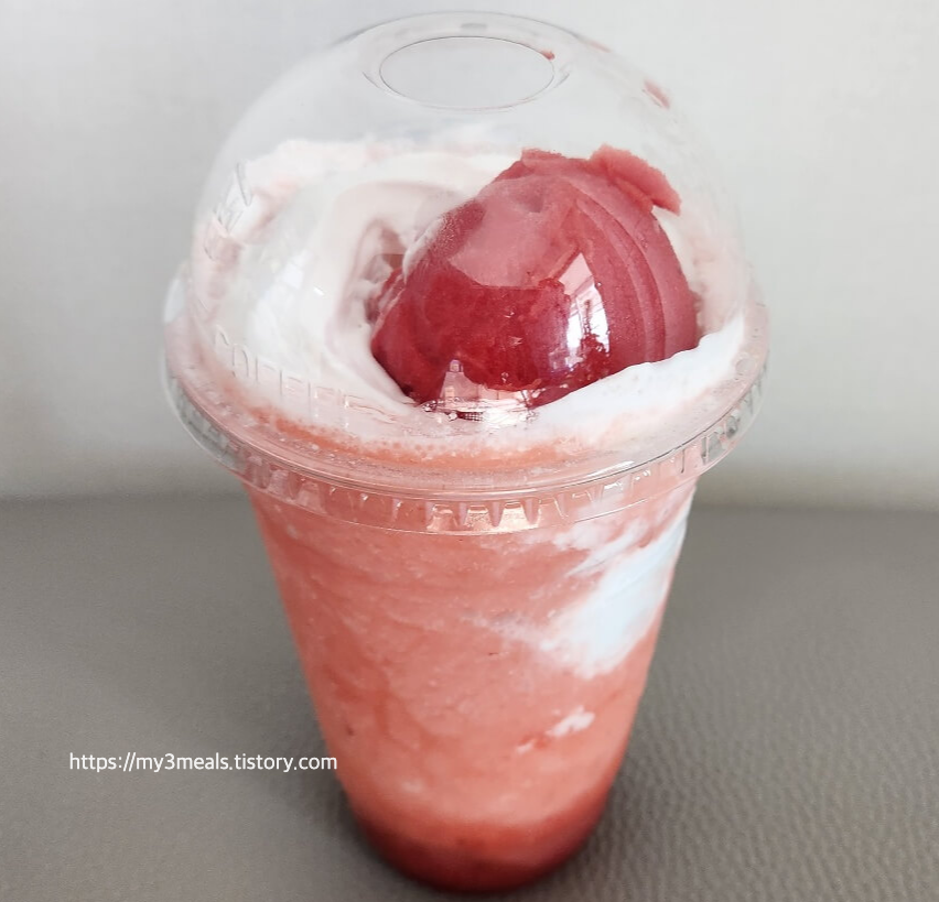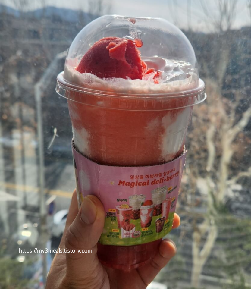 주말, 날씨가 너무 좋아 집에만 있기 아쉬웠던 하루. 그래서 딸과 함께 특별한 시간을 보내기로 했어요. 평소에도 딸기 디저트를 좋아하는 딸을 위해 선택한 메뉴는 바로 ‘딸기젤라또 퐁당 프라페’! 이 음료는 이름만 들어도 설레는 달콤함이 가득 느껴지는 메뉴였는데, 실제로 마셔보니 기대 이상이었습니다.2. 맛