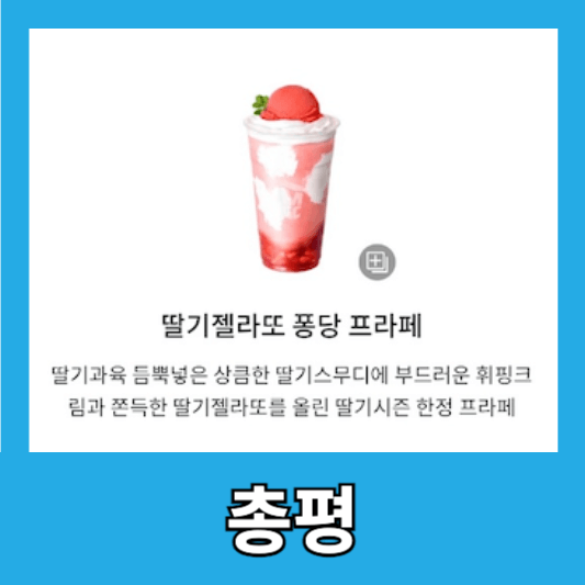 맑고 화창한 주말, 딸과 함께 마신 딸기젤라또 퐁당 프라페는 단순한 음료가 아니라 행복한 추억을 만들어준 특별한 시간이었어요. 부드러움과 상큼함이 완벽한 조화를 이루는 이 음료는 사랑하는 사람과 함께하면 더 맛있게 느껴질 거예요. 다음 주말에도 또 이 음료를 마시러 가고 싶을 만큼 만족스러웠습니다.