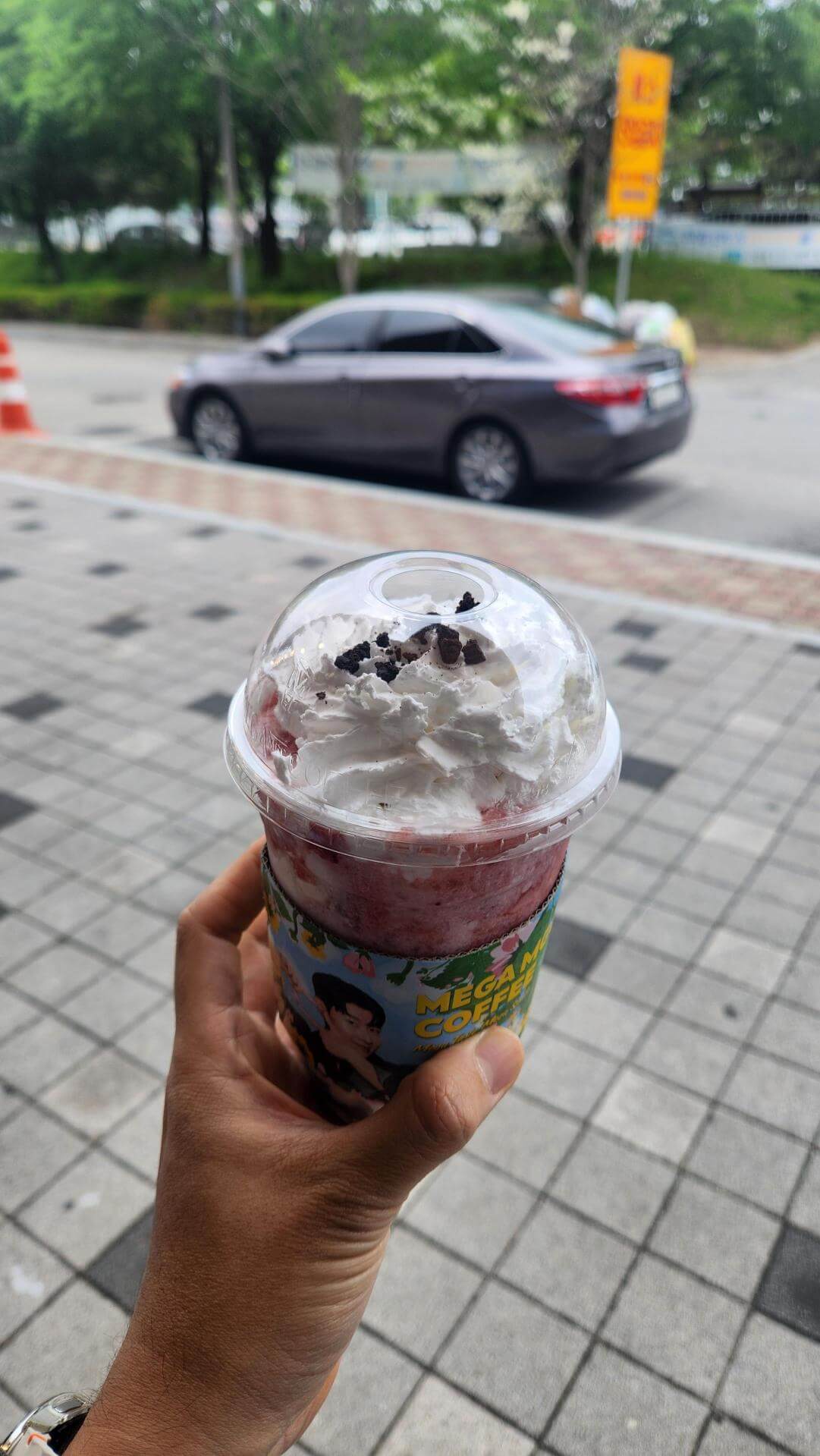 메가커피에서 딸기쿠키프라페를 처음 봤을 때, ‘이건 꼭 먹어봐야겠다’는 생각이 들 정도로 비주얼이 달콤+귀여움 그 자체였어요. 핑크빛 딸기 프라페에 부드러운 휘핑크림, 그 위에 쿠키 크런치가 송송 올라가 있어서 한눈에 봐도 디저트처럼 느껴졌습니다.