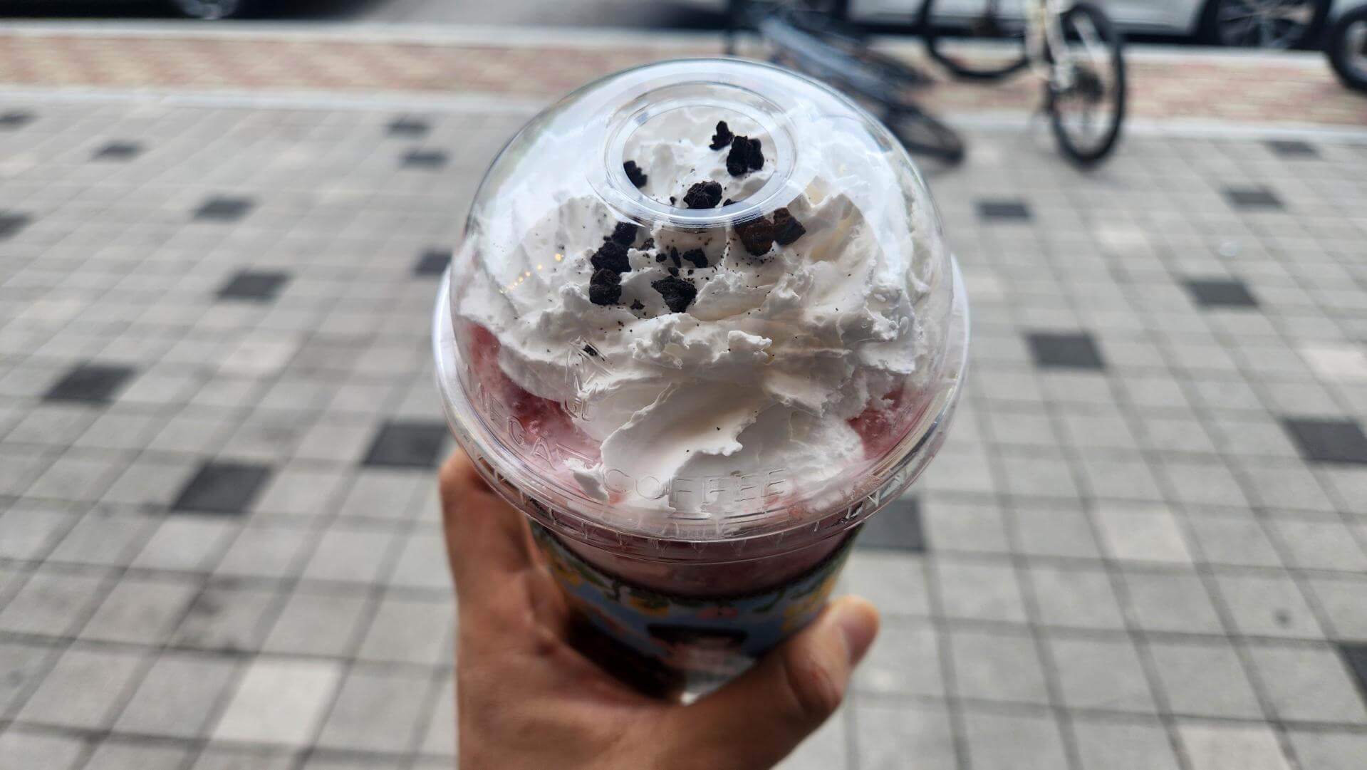 첫 모금은 딸기 아이스크림 느낌이 강했고, 먹다 보면 쿠키조각들이 혀에 사르르 씹혀서 식감이 살아있어요. 기본적으로 프라페라 얼음을 블렌딩한 타입이라 여름에 시원하게 마시기에도 정말 잘 어울리는 메뉴였어요.