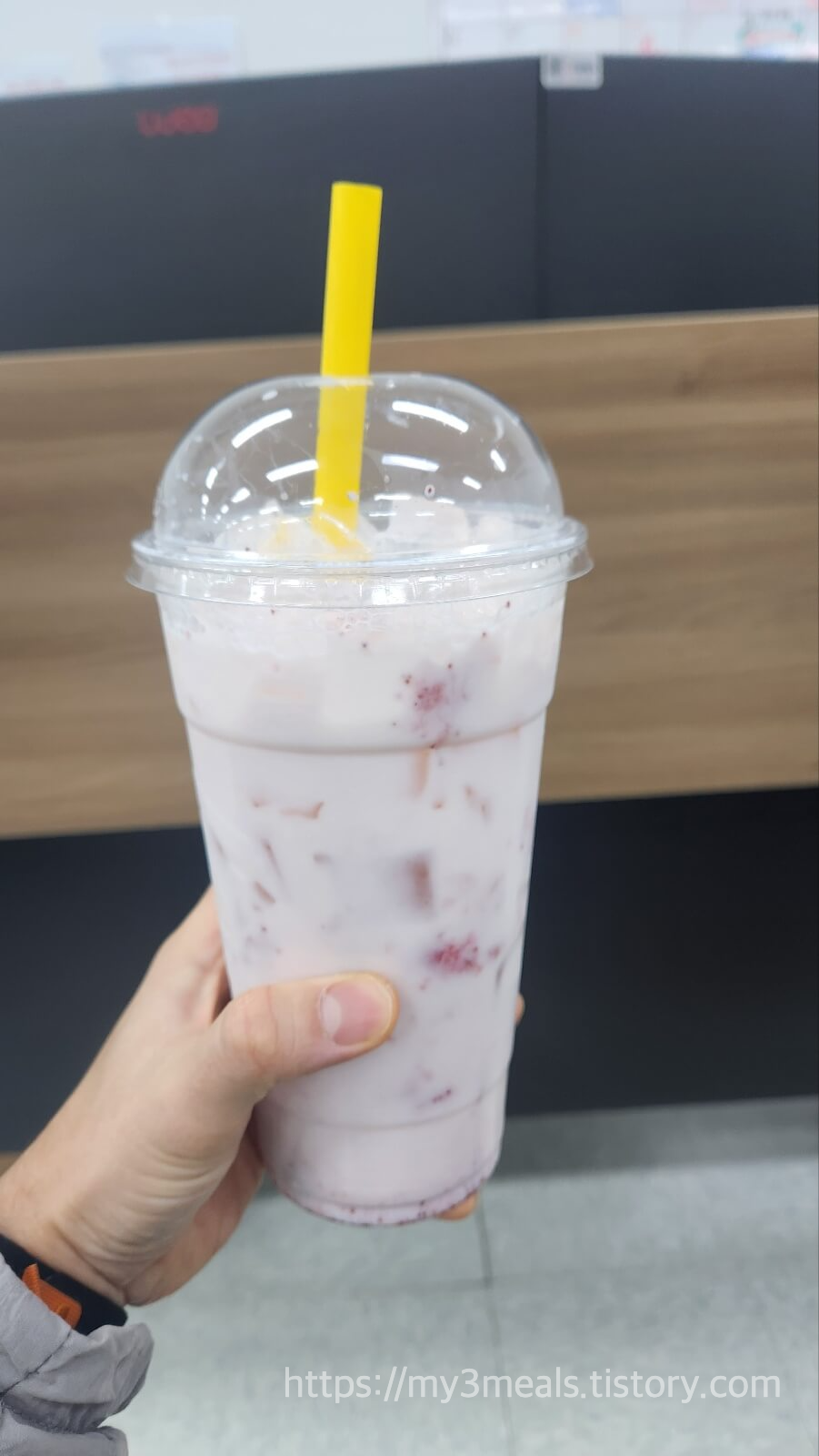 다만, 딸기 맛이 생각보다 진하지 않아 조금 은은한 느낌이 있었어요. 진한 딸기향이나 강렬한 맛을 기대하셨다면 약간 아쉬울 수도 있을 것 같아요. 하지만 아침에 즐기기엔 오히려 이런 은은한 맛이 더 좋았던 것 같아요. 부담스럽지 않으면서도 적당히 달콤하고 상큼한 맛이 입맛을 돋우는 데 충분했답니다. 특히 푸짐한 양 덕분에 한 잔으로도 포만감을 느낄 수 있어, 아침 대용으로도 괜찮은 선택이었어요.