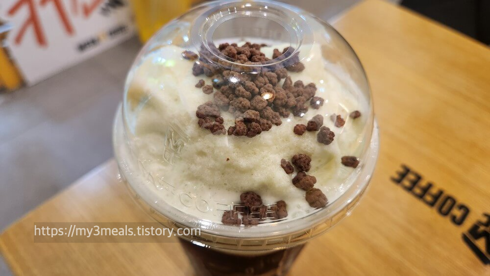 음료 위에 올려진 초코 아몬드 토핑은 단순히 보기만 좋은 것이 아니라, 씹을 때마다 바삭한 식감을 선사해요. 부드러운 프라페와 함께 어우러지면서 입안에서 터지는 그 바삭함이 정말 매력적이었답니다. 한 입 한 입 먹을 때마다 다양한 식감이 느껴져서 마시는 내내 지루하지 않았어요.