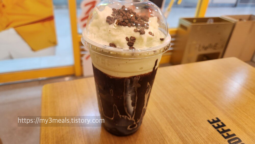 음료의 벽면을 감싸고 있는 초코 시럽이 단단하게 굳어 있어서 빨대로 톡톡 눌러가며 깨는 재미가 있었어요. 와그작! 와그작! 부서지는 시럽의 식감이 너무 좋더라구요. 이 초코 시럽을 깨트려 먹을 때마다 입안 가득 초코의 진한 맛이 퍼지면서 음료의 달콤함을 한층 더해줬어요. 스트레스가 한순간에 사라지는 느낌이랄까요?