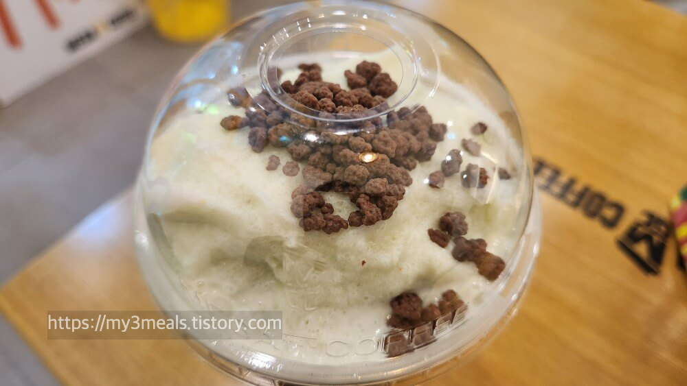초코 눈송이 피스타치오 프라페는 스트레스 받을 때마다 생각나는 달콤한 한 잔이에요. 초코의 달콤함과 피스타치오의 고소함이 어우러져 한 모금 마실 때마다 마음이 편안해지는 기분이에요. 달콤하게 충전하고 싶을 때 강력 추천해요! 초코 시럽을 눌러가며 깨서 먹는 재미까지 더해져 음료를 더 즐겁게 즐길 수 있었답니다.