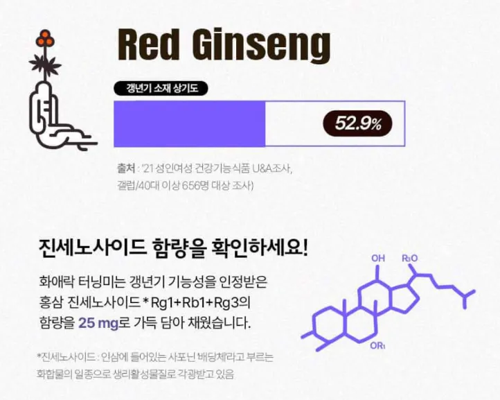 <사진 1, 2=정관장, 사진 3=내돈내산> 갱년기란? 노화나 질병에 의해 난소 기능이 쇠퇴하면서 폐경과 관련된 심리적, 신체적 변화를 겪는 시기입니다. 즉, 난소 기능이 저하되어 여성 호르몬이 감소되고 체네 호르몬 불균형이 일어나서 변화가 일어나는 시기입니다. 이런 여성 갱년기는 어떤 영향을 미칠까요? 평균적으로 49세의 여성부터 폐경기가 접어들고 폐경 전후 약 10년 정도로 갱년기로 볼 수 있습니다. 첫 번째로 여성 호르몬이 줄어들어 활력이 떨어집니다. 두 번째로 우리 몸에는 몸속 세포를 공격하는 활성 산소가 생성됩니다. 나이가 많아지고 갱년기 때 활성 산소 제거하는 능력이 감소합니다. 특히 뇌, 혈관, 피부는 활성산소에 취약한 부분입니다. 세 번째로 골다공증, 심장질환위험이 있습니다. 갱년기 여성 건강을 위해 정관장에서 30여 년 동안 고민하여 만든 제품, 사랑받고 있는 스테디셀러, 정관장 화애락 터닝미에 대해 성분, 효능, 파는 곳, 가격에 대해 자세히 알아보겠습니다.