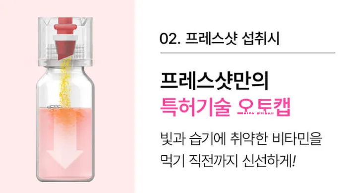 하루 1회, 1회당 1병을 드시면 됩니다. 프레스샷을 먹는 방법은 간단합니다. 오전 중 공복에 드시는 것이 가장 좋습니다. 비타민 분말은 빛과 습기에 취약하기 때문에 섭취 전에는 분말과 액상을 따로 보관하여 더욱 신선하고 안전하게 먹을 수 있습니다