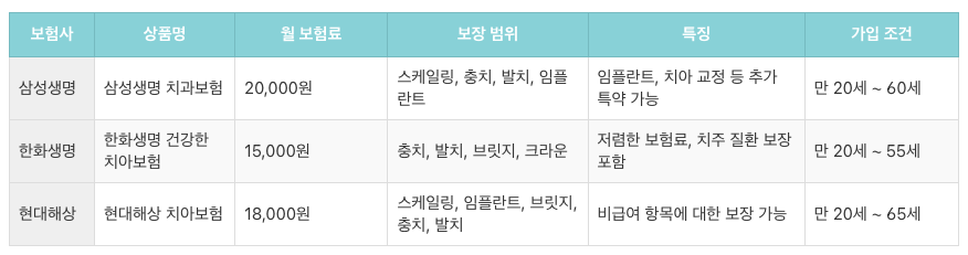- 보장 범위: 스케일링, 충치 치료, 임플란트, 크라운 등 다양한 치과 치료를 포함하는지 확인해야 합니다.